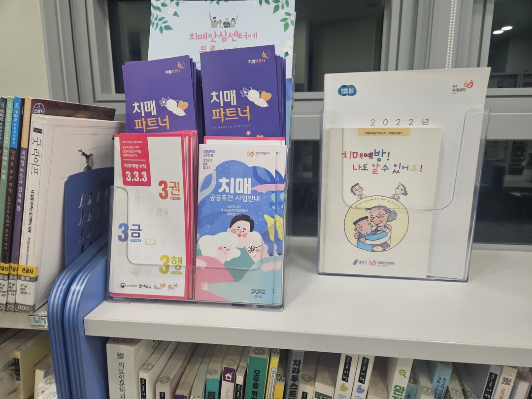 | ▲ 용인시 기흥구 청덕도서관 내 비치된 치매 관련 국가 사업 간행물 및 홍보물. [김명주 기자] |
