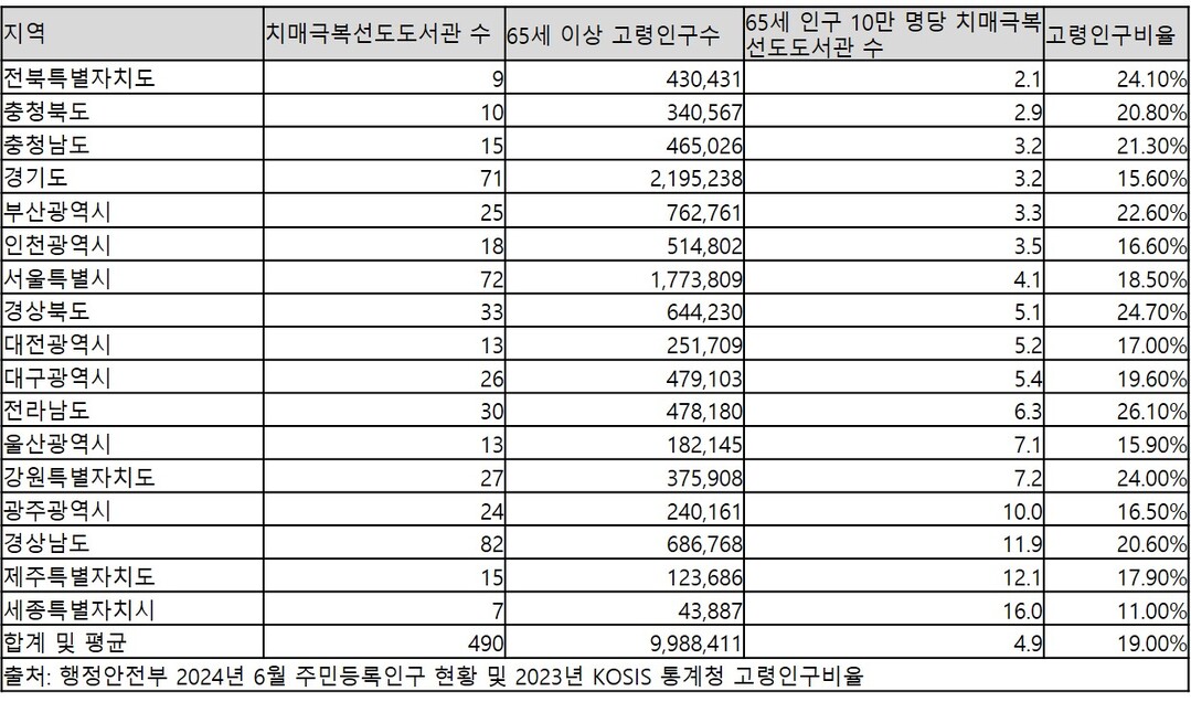 일부 초고령지역, 전국 평균보다 치매도서관 적어