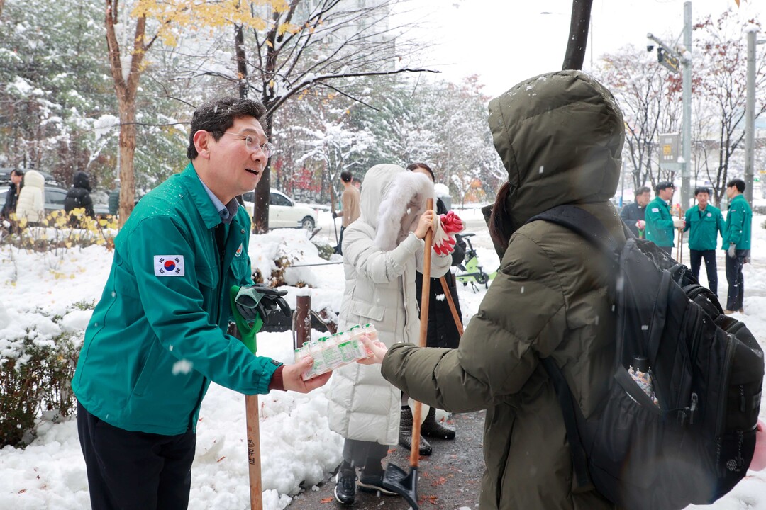 | ▲ 28일 제설작업 중 한 대학생으로부터 요구르트를 전달 받고 있는 이상일 요인시장. [용인시 제공] |