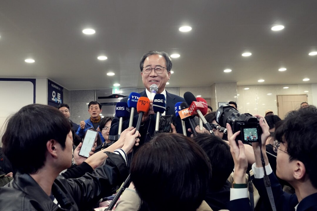 ▲ 김석준 후보가 자정을 넘어 당선이 확실시되자 언론사 인터뷰를 하고 있다. [김석준 선거캠프 제공]
