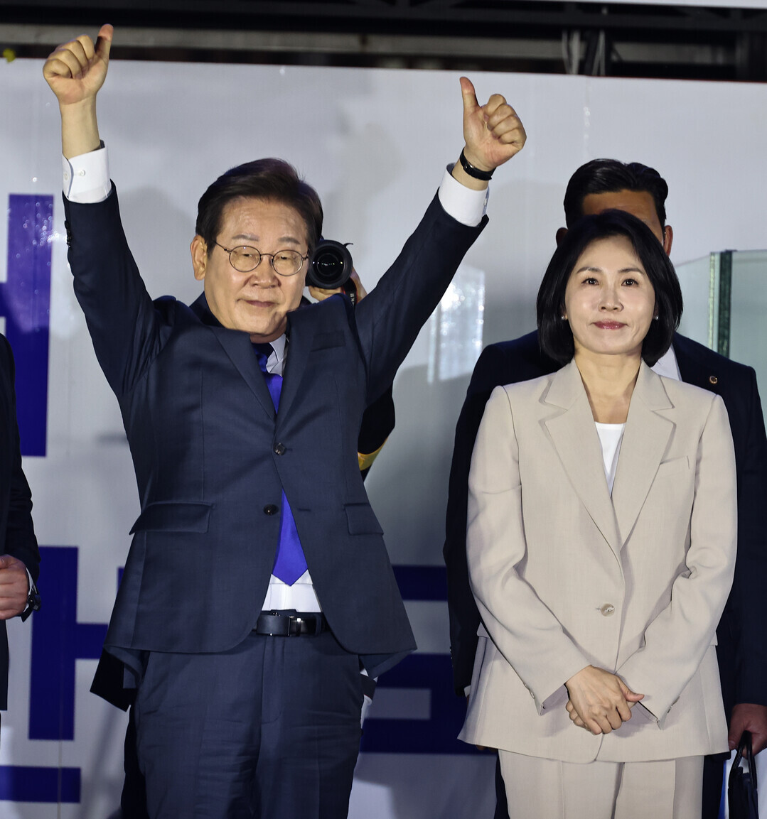 | ▲ 이재명 대통령 당선인이 4일 오전 1시 10분쯤 국회 앞에 설치된 무대에 올라 부인 김혜경 여사와 함께 지지자들에게 손을 들어 인사하고 있다. [이상훈 선임기자] |