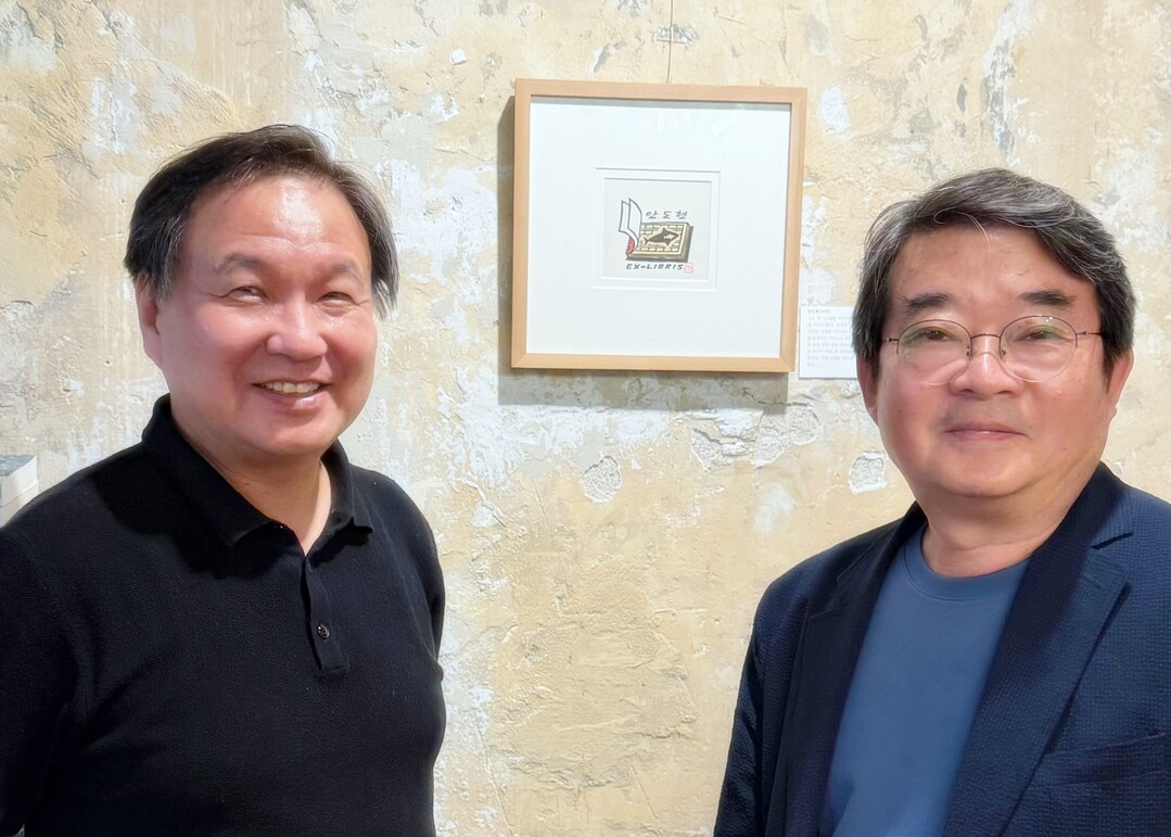 ▲'창비 부산' 전시장에서 자신의 장서표 앞에 선 안도현(오른쪽) 시인과 남궁산. [조용호 문학전문기자]
