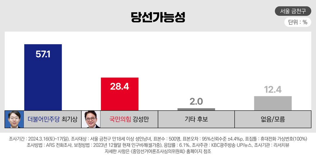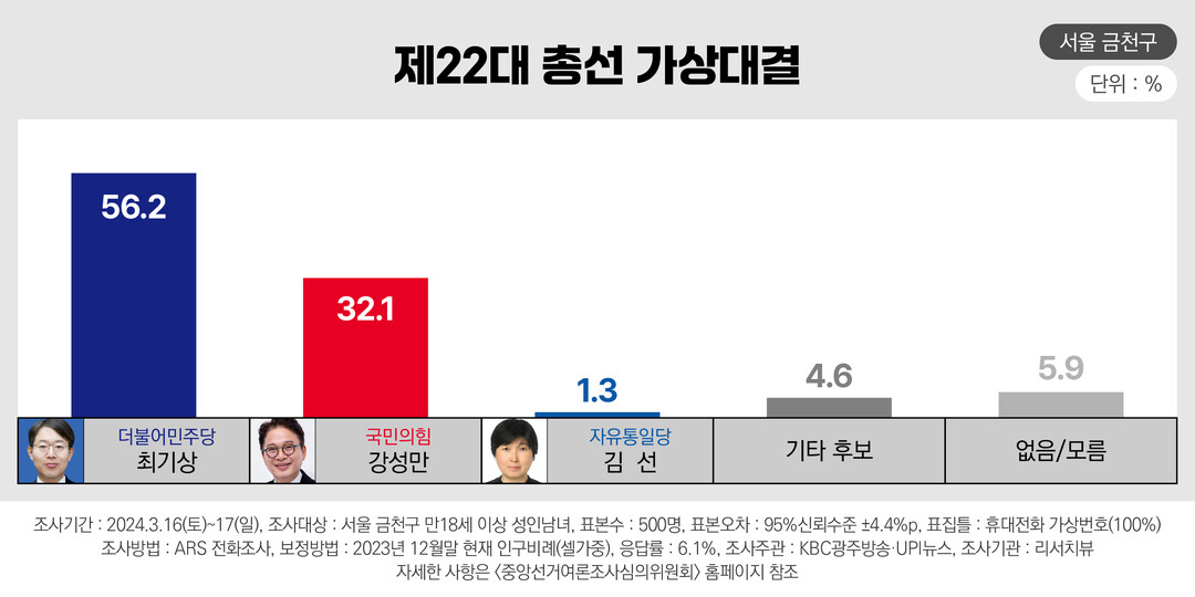 4·10 총선 서울 금천에 출마한 더불어민주당 최기상 후보가 국민의힘 강성만 후보를 크게 앞서고 있는 것으로 19일 나타났다.