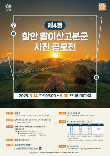 군 관계자는 "말이산고분군의 유네스코 세계유산 등재 2주년을 기념해 국민과 함께 그 가치를 되새기고자 이번 사진공모전을 마련했다"며 "말이산고분군을 사랑하는 많은 분들의 관심과 참여를 부탁드린다"고 전했다.