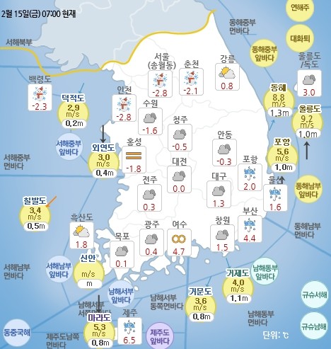 15일 전국이 대체로 흐린 가운데 전국 곳곳에 눈이나 비가 오겠다.