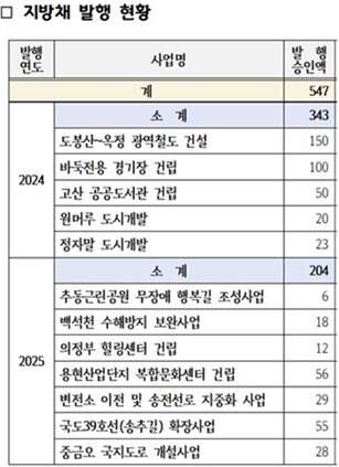 이와 함께 의정부시가 정 시의원에게 제출한 자료에 의하면 전철 7호선 연장선인 서울 도봉산역에서 양주 옥정역까지 철도 건설 분담금 150억 원, 바둑전용경기장 건립비 100억 원 등 지난해 5건에 343억 원의 지방채를 발행했다.