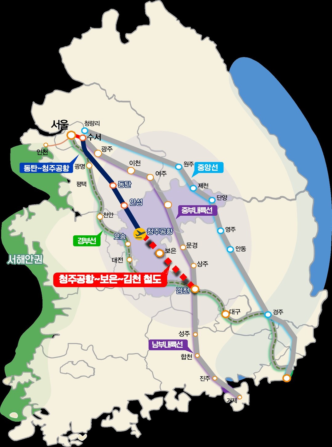 청주공항~보은~김천 철도 노선은 수도권~중부~남부를 최단 직결노선으로 연결해 주는 사업으로 약 3조 원의 사업비를 투입해 96.1km의 철도 노선을 구축하게 된다. 해당 사업은 올 하반기 발표될 제5차 국가철도망구축계획 반영돼야 사업이 추진될 수 있다.