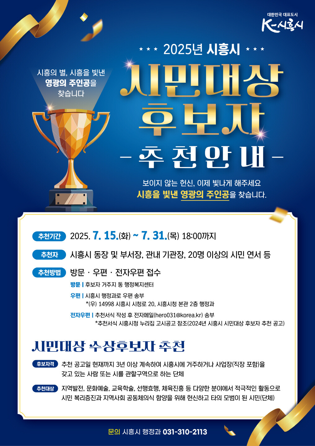 | ▲ '2025년 시흥시 시민대상 후보자 추천 안내' 포스터. [시흥시 제공] |