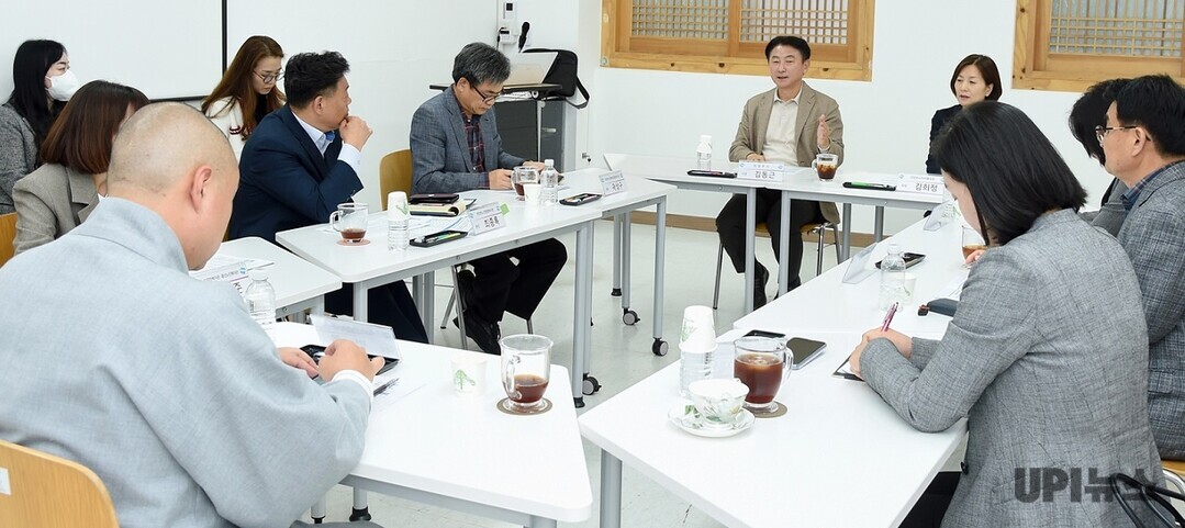 | ▲ 김동근 의정부시장이 예산삭감 통보받은 7개 사회복지기관들의 요청으로 27일 송산노인종합복지관에서 간담회를 하고 있다. [의정부시 제공] |