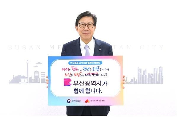 박형준 부산시장은 27일 저출생과 고령화 등 인구구조 변화로 인한 문제를 알리고 사회적 인식을 개선하기 위한 '인구문제 인식개선 릴레이 캠페인'에 동참했다.