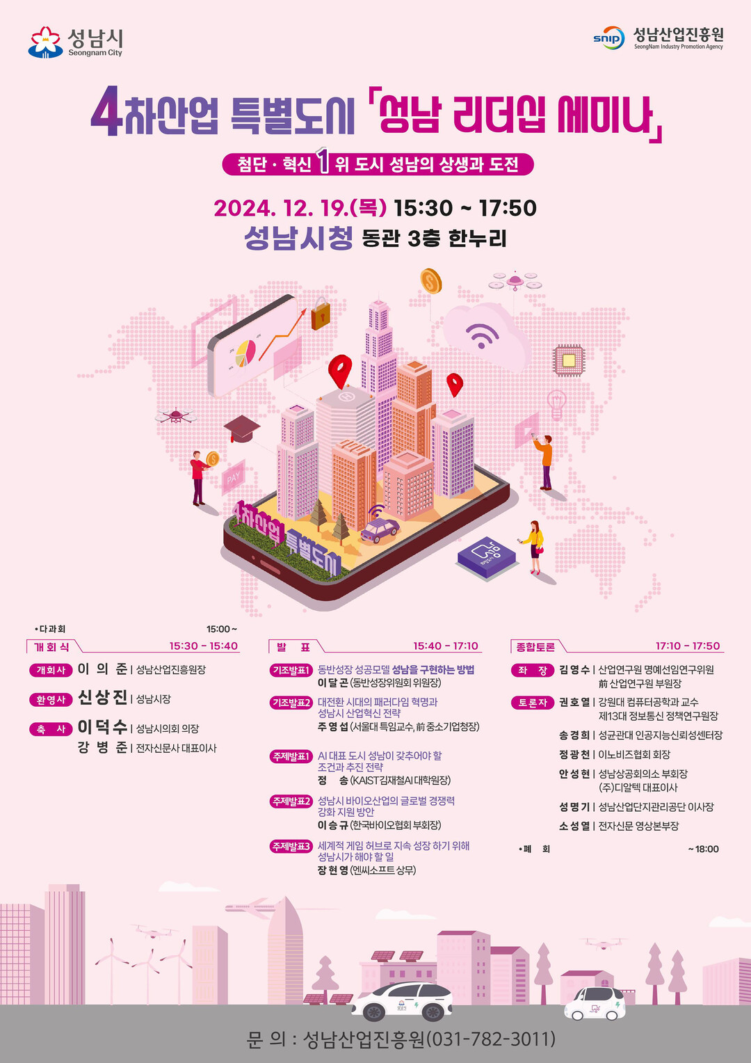 '첨단·혁신 1위 도시 성남의 상생과 도전'을 주제로 마련된 이번 세미나는 이의준 성남산업진흥원장의 개회사와 신상진 시장의 환영사로 시작된다.