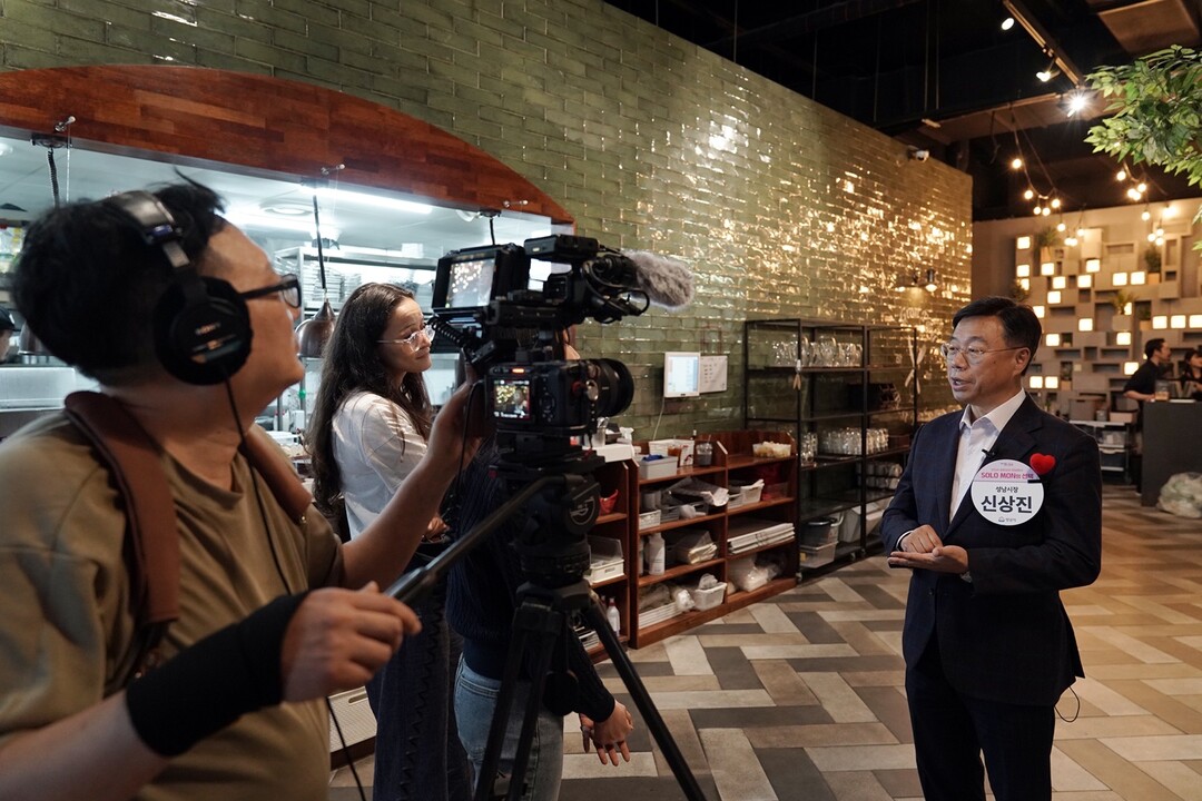| ▲ 신상진 성남시장이 지난 16일 열린 7차 '솔로몬의 선택' 행사장에서 영국 BBC 취재팀과 인터뷰를 하고 있다. [성남시 제공] |