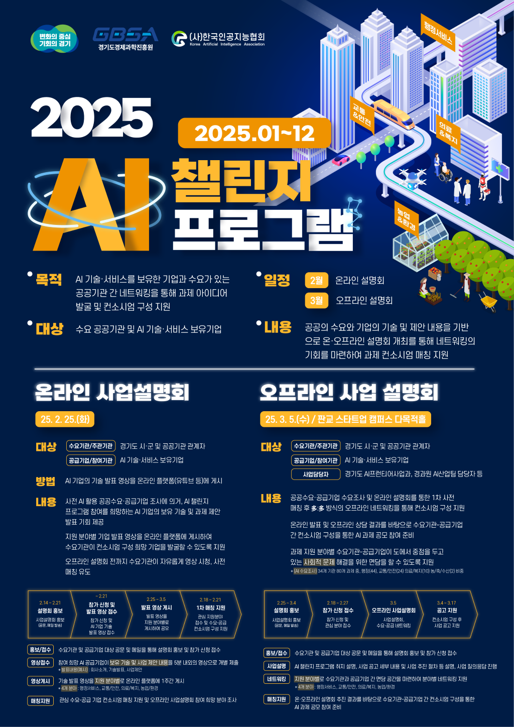 경기도와 경기도경제과학진흥원은 경기도 공공서비스 혁신을 위한 '2025년 AI(인공지능) 챌린지 프로그램' 사업을 추진한다고 19일 밝혔다.