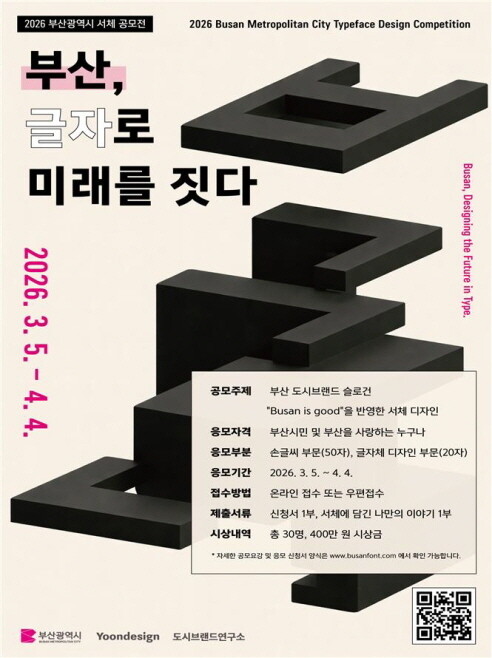대상 수상작은 전문가 보완 절차를 거쳐 '시민공모 서체'로 개발돼 부산 도시브랜드 자산으로 활용될 예정이다. 자세한 내용은 서체 디자인 공모전 누리집에서 확인 가능하다.