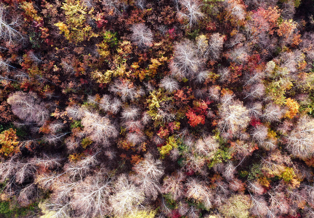 | ▲ 홍천군 내면의 잎이 떨어져 하얀 속살을 보이는 자작나무 숲 사이로 보이는 단풍. [이상훈 선임기자] |