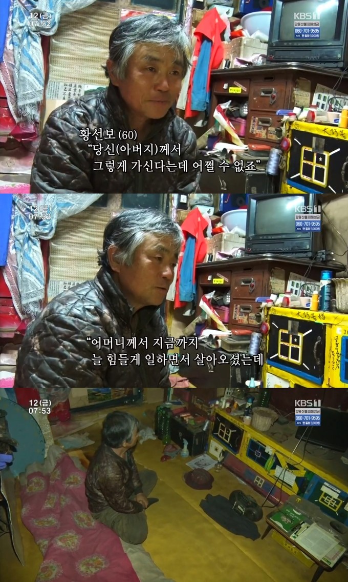이날 방송에서 황선보 씨는 4년 전 세상을 떠난 부친의 산소에 다녀온 뒤 집에서 사진 앨범을 들여다 봤다. 그는 제작진에게 "당신(아버지)이 그렇게 가신다는데 어쩔 수 없지 않냐"며 눈시울을 붉혔다.