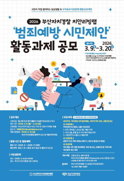 부산시 자치경찰위원회(위원장 김철준)가 부산디자인진흥원과 함께 오는 9일부터 20일까지 '2026년 부산자치경찰 치안리빙랩 공모전'을 개최한다고 4일 밝혔다.