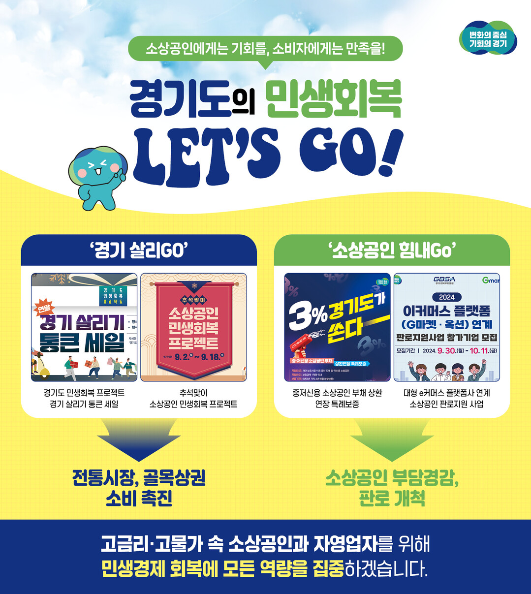 경기도는 올해 고금리와 고물가로 어려움을 겪는 소상공인과 서민을 위해 '민생회복 렛츠고(Let's Go)!' 프로젝트를 추진했다. 이 프로젝트는 '경기 살리GO'와 '소상공인 힘내Go'로 나뉘어 진행됐다.