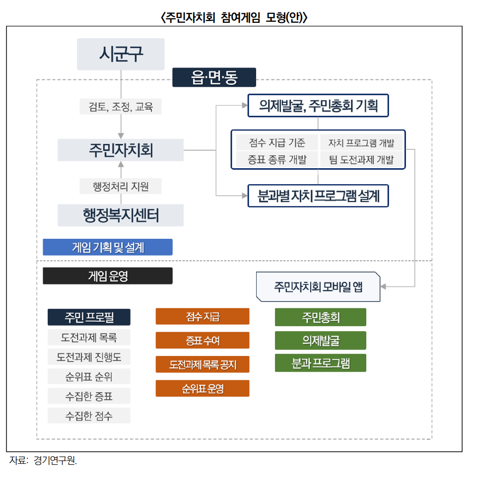 경기연구원은 이 같은 문제에 착안해 주민자치에 '참여해야 하는 이유'에 집중했고, 재미있는 곳에 참여가 있다며 게임 요소를 도입하는 방안을 제안했다. 임무 해결, 타인과의 협력, 가치에 맞는 행동 수행 등의 내재적 동기와, 상품이나 금전 보상 같은 외재적 동기가 어우러지면 참여율을 높일 수 있다는 분석이다.