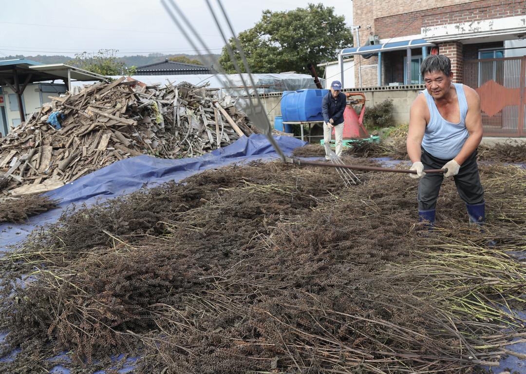 ▲ 양구군 학교리의 한 농가에서 가을 햇살에 잘 말린 들깨를 도리깨를 이용해 낱알을 털고 있다.[이상훈 선임기자]