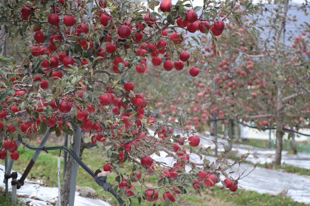 최근 재배 지역이 최북단까지 올라간 사과도 빨간 옷을 입고 지나가는 행인을 유혹한다. 대부분 수확을 마쳤으나 길가의 나무들은 아직 수확되지 않아 열매가 달려 있다.