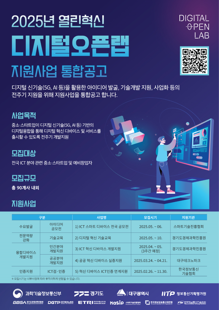 경기도는 1일 '2025 열린 혁신 디지털 오픈랩' 지원사업 통합 공고를 발표하고, 참여기업 모집에 나섰다. 5G, 인공지능(AI) 등 첨단 기술을 활용해 혁신적인 디바이스와 서비스를 개발하는 중소기업과 스타트업을 대상으로, 제품 개발부터 사업화까지 전 과정을 지원한다.