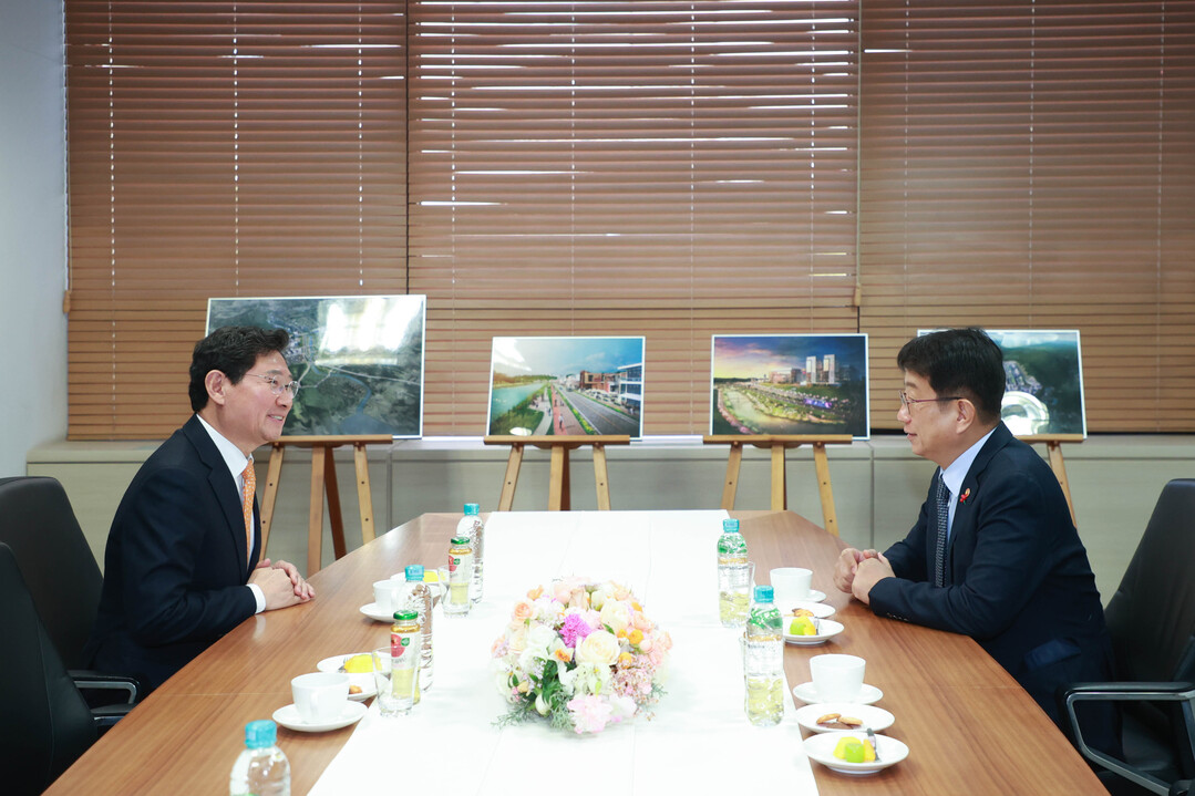 ▲ 지난해 12월 26일 박상우 국토교통부장관(오른쪽)에게 '용인 첨단시스템반도체 클러스터 국가산업단지' 발전을 위한 의견을 전달하고 있는 이상일 용인시장.  [용인시 제공]