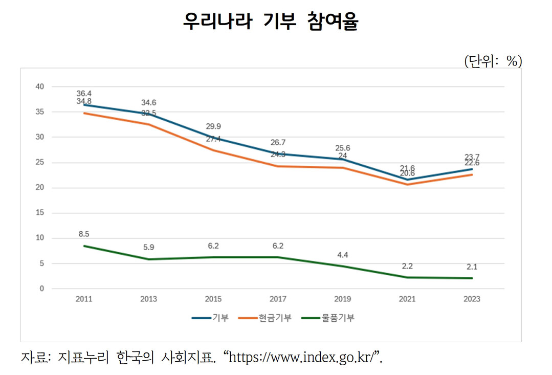 ▲ 우리나라 국민 기부 참여율. [경기연구원 제공]