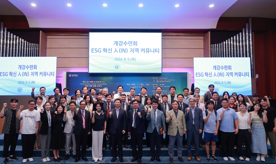 ▲ 지난 5일 열린 칼빈대 'ESG 혁신人(IN) 지역 커뮤니티' 특강 참석자들이 기념촬영을 하고 있다.  [용인시 제공]