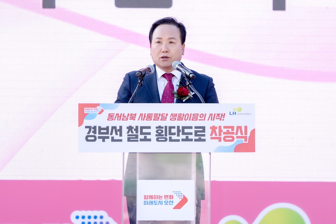 | ▲ 지난해 12월 26일 열린 경부선 철도 횡단도로 착공식에서 이권재 시장이 축사를 하고 있다.[오산시 제공] |