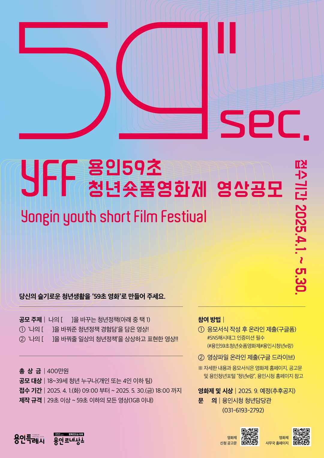 20일 용인시에 따르면 다음달 1일부터 오는 5월 30일까지 '나의 [ ]을(를) 바꾸는 청년정책'을 주제로 상금 400만 원의 '용인 59초 청년 숏폼 영화제' 참여 영상을 공모한다. 전국 18~39세의 청년이라면 누구나 참여할 수 있다.
