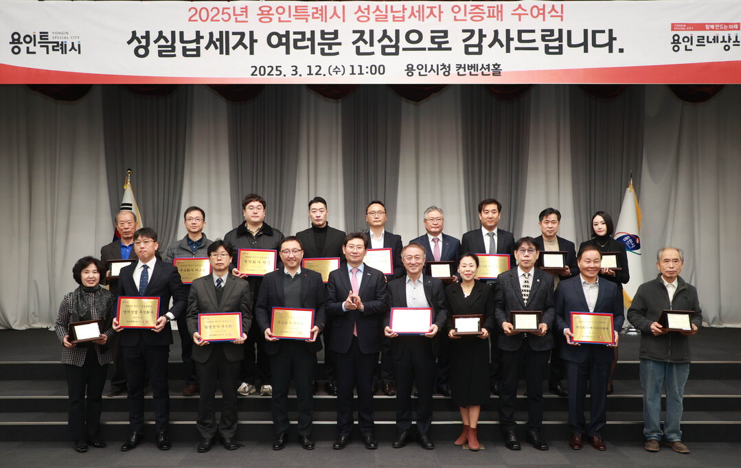 13일 용인시에 따르면 이상일 용인시장은 지난 12일 시청 컨벤션홀에서 성실납세자로 선정된 개인 9명에게 인증패를, 법인 10곳에 인증 현판을 각각 전달하고 격려했다.