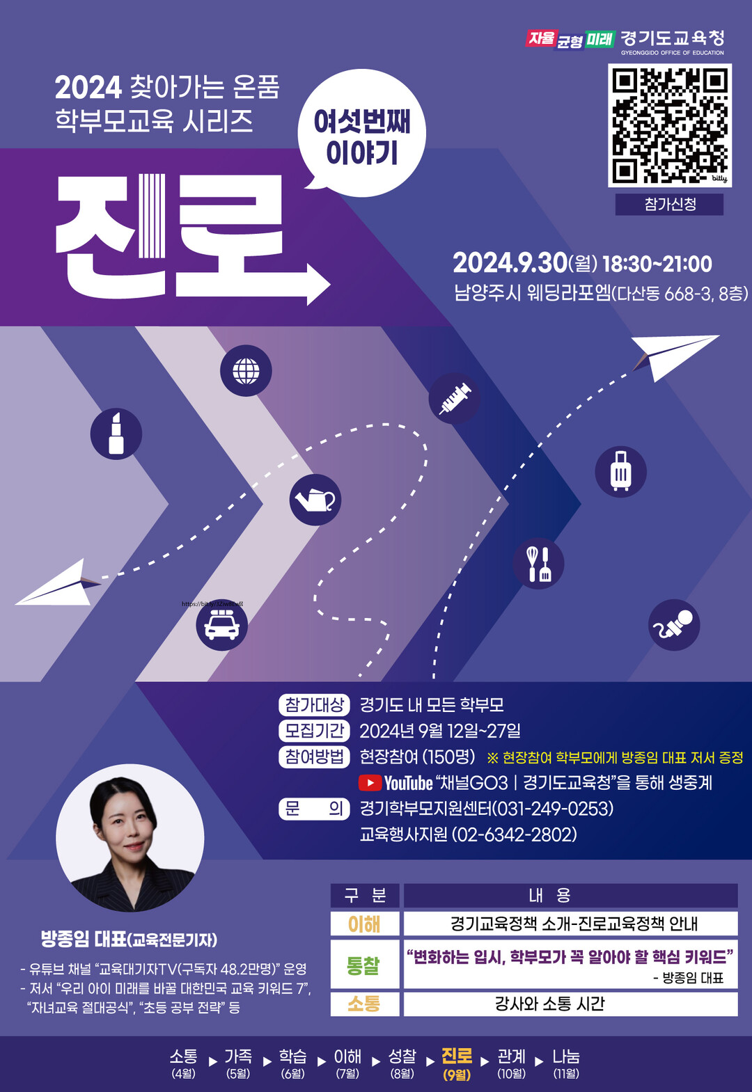 이해의 시간에는 도교육청 진로교육 정책을 안내를 통해 학부모의 이해를 돕고, 통찰의 시간에는 방종임 대표(유튜브 교육대기자 TV 운영)가 '변화하는 입시, 학부모가 꼭 알아야 할 핵심 키워드'를 주제로 특강을 진행한다.