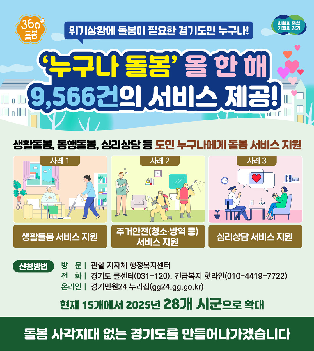 경기도는 생활돌봄, 주거 안전, 심리 상담 등 다양한 분야에서 기존 돌봄의 공백을 보완해 모든 도민에게 돌봄서비스를 지원하는 '누구나 돌봄'을 올해 1월부터 11월 말까지 운영한 결과 9566건의 서비스를 제공했다고 9일 밝혔다. 도는 내년부터 서비스 지원 지역을 기존 15개 시군에서 28개 시군으로 확대한다.