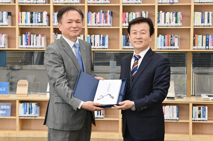 ▲ 지난 21일 최용준 LIG 대표이사가 진주 K-기업가정신센터에서 조규일 시장에 책을 전달하고 있다. [진주시 제공]