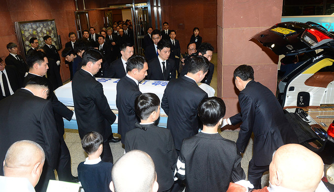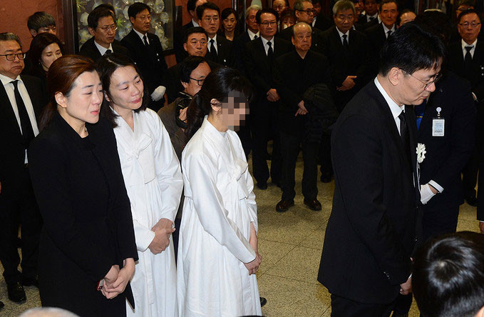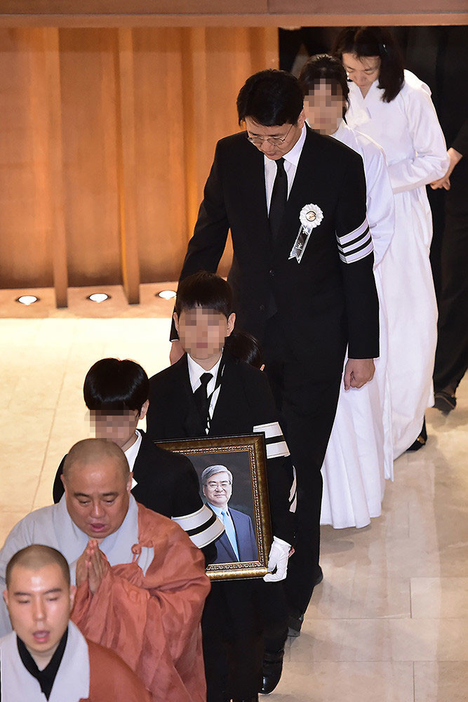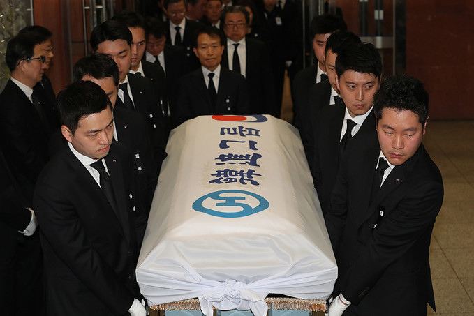 16일 오전 고 조양호 한진그룹 회장 영결식에서 유족들이 고인의 영정을 앞세운 채 영결식장으로 향하고 있다.