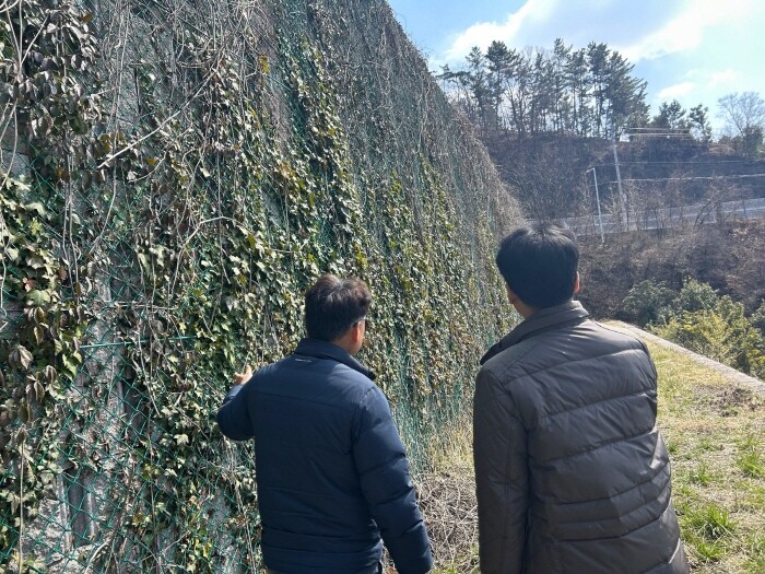 ▲ 진주시 관계자들이 해빙기 시설물 안전관리 작업를 하고 있다. [진주시 제공]