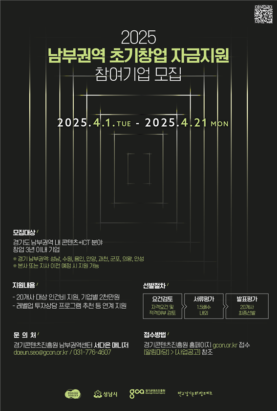 지원 대상은 사업 공고일 기준으로 수원, 성남, 용인, 안양, 과천, 군포, 의왕, 안성 등 경기도 남부권역에 소재한 창업 3년 이내 콘텐츠 기업이다. 선정된 20개 기업에는 각 2000만 원의 인건비를 지원하며, 우수 기업 대상 투자 상담 프로그램 참여 기회 제공 등 추가적인 지원도 제공할 예정이다.