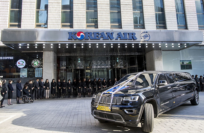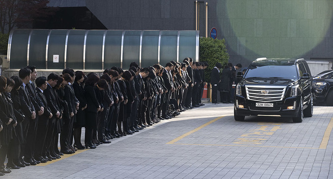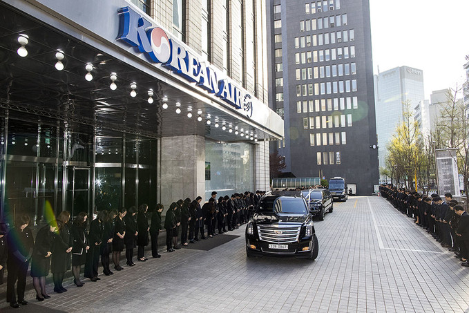 16일 오전 고 조양호 한진그룹 회장 운구 차량이 신촌세브란스병원 장례식장에서 영결식을 마친 뒤 장지로 가기전 서울 중구 대한항공 서소문 사옥에 들어서고 있다.