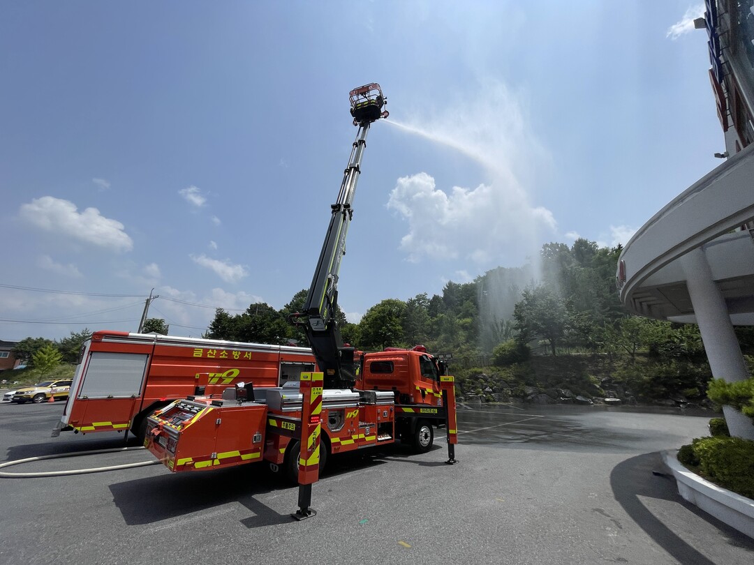 | ▲새로 도입한 소형사다리차 방수 모습.[충남소방본부 제공] |