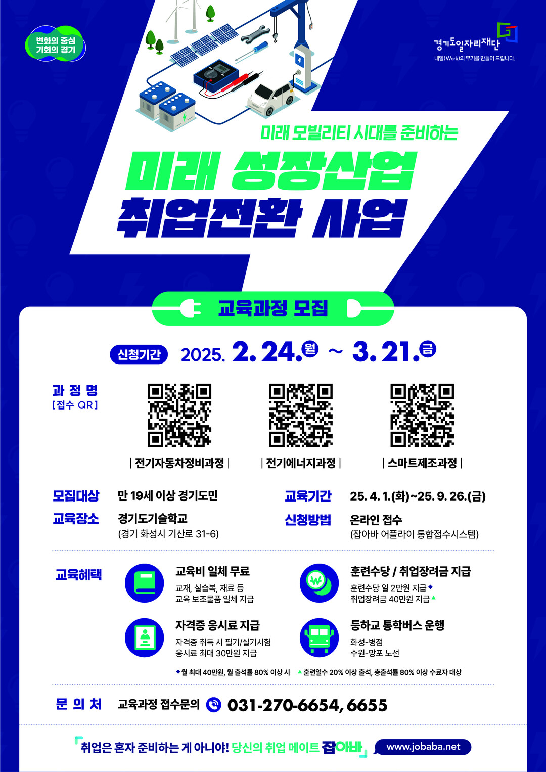 이진희 경기도일자리재단 융합인재본부장은 "전기차, 전기에너지, 스마트제조 등 미래 산업에서 요구하는 기술을 익히고, 취업까지 연계될 수 있도록 적극 지원할 계획"이라며 "많은 청년과 구직자들이 이번 교육을 통해 성장할 기회를 잡길 바란다"고 말했다.