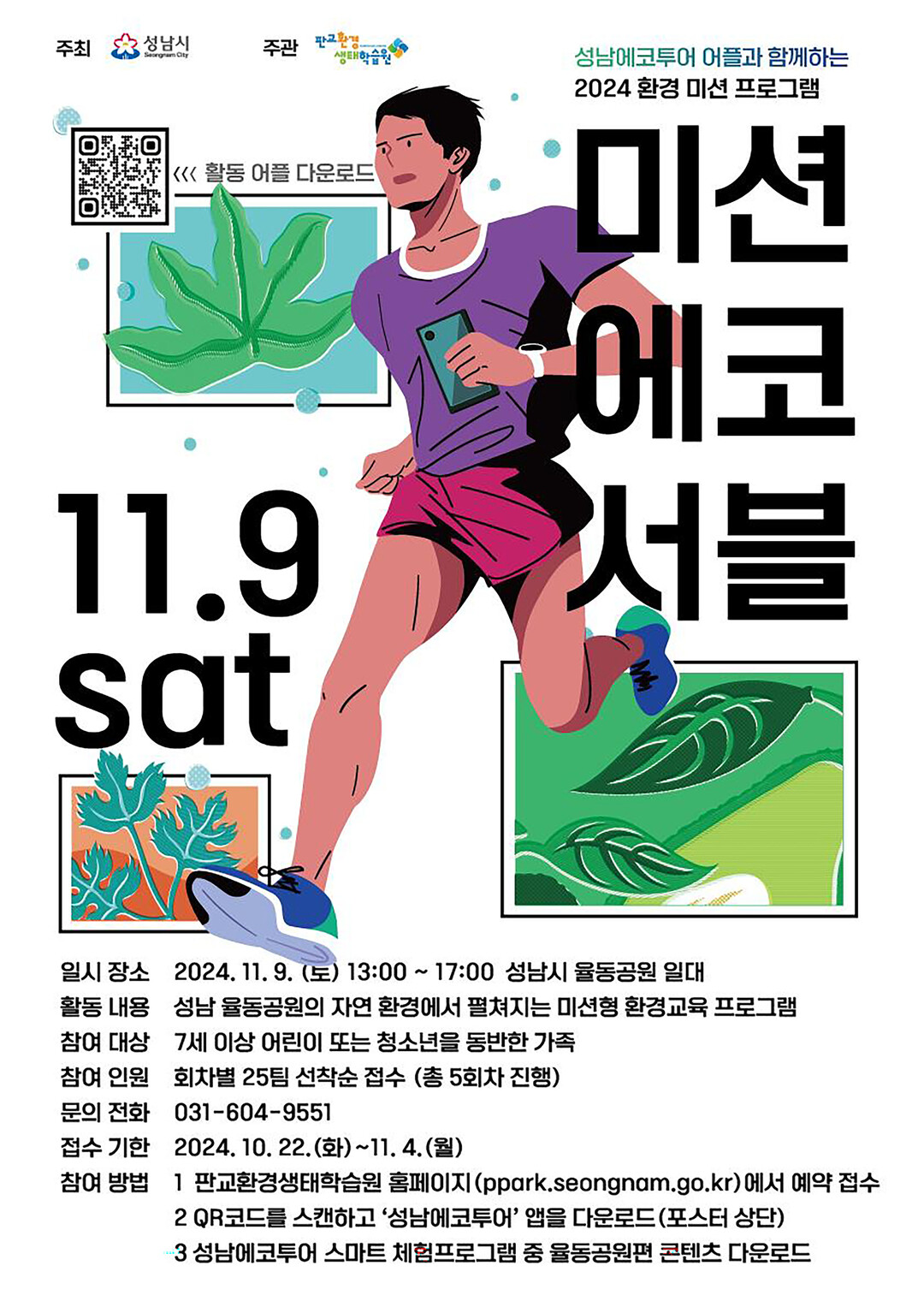 경기 성남시는 오는 9일 오후 1~5시 율동공원에서 초·중생 가족 125개 팀(최대 500명)이 참여하는 체험형 환경 교육 '미션 에코서블' 행사를 연다.