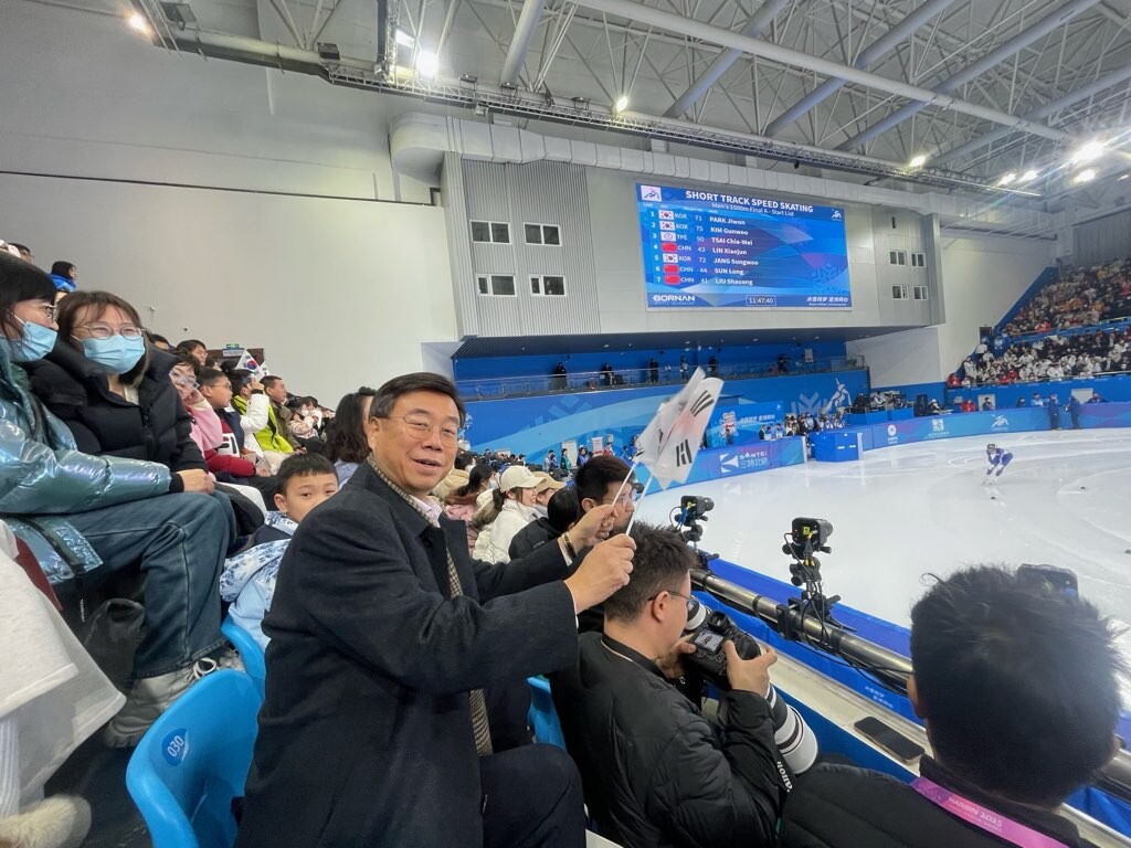 | ▲ 하얼빈 빙상장서 태극기를 흔들며 선수들을 응원하고 있는 신상진 성남시장, [성남시 제공] |