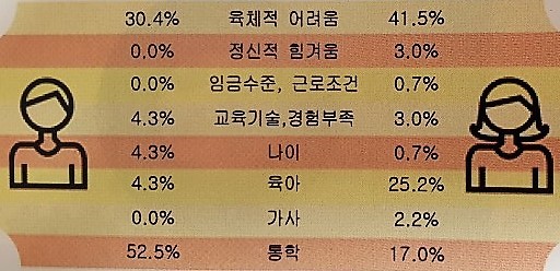 그런데 이를 성별로 살펴보면 남성은 통합(52.2%)과 육체적 어려움(30.4%)으로 인해 구직활동을 하지 않는다는 응답이 높았고, 여성은 경제활동을 하지 않는 이유로 육체적 어려움(41.5%)과 육아(25.2%)를 1순위로 꼽았다.
