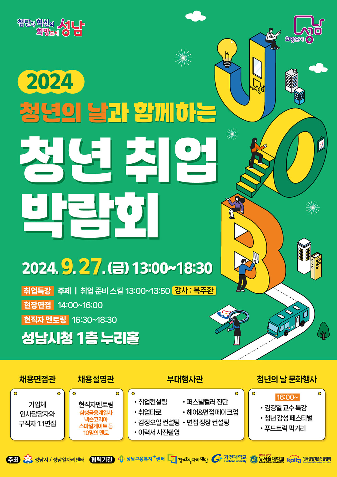 경기 성남시는 오는 27일 오후 1시부터 6시 30분까지 성남시청 1층 누리홀에서 '2024 청년의 날과 함께하는 청년 취업박람회'를 연다고 20일 밝혔다.