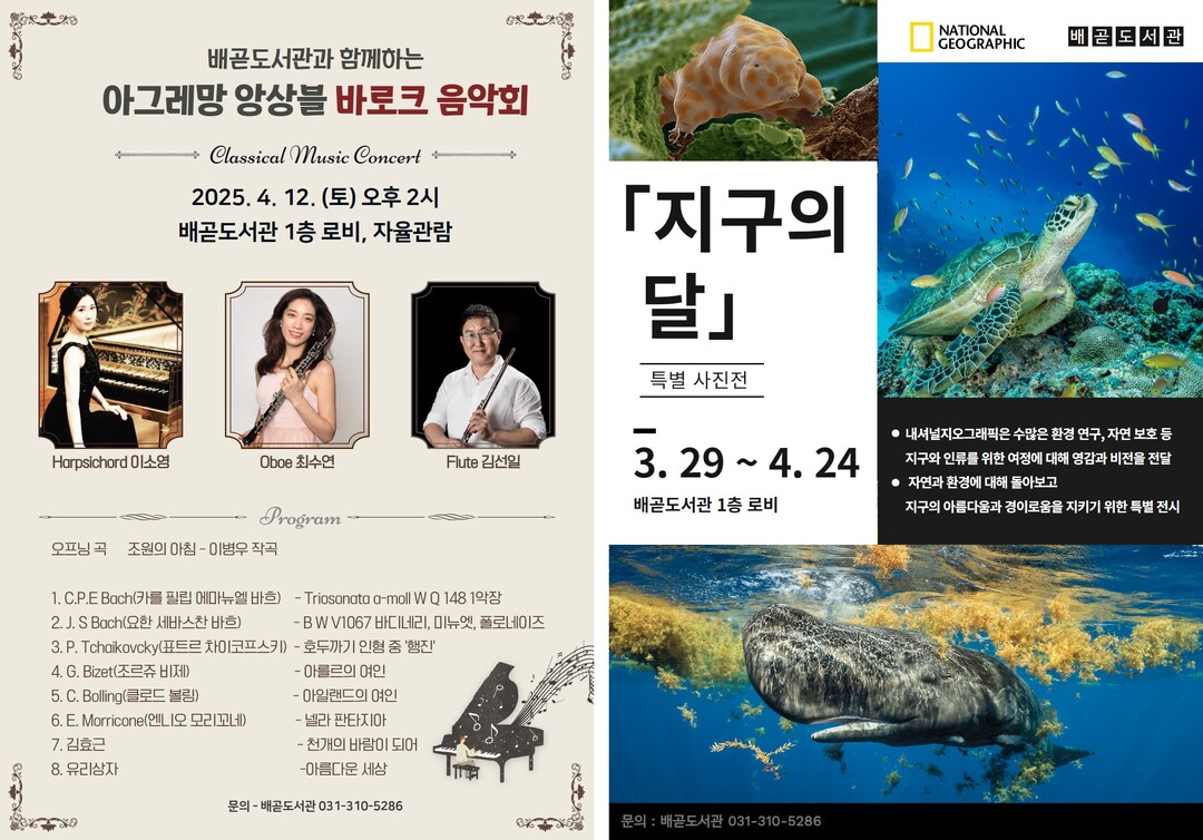 같은 날 오후 2시 도서관 1층 로비에서는 아름다운 선율로 가득한 바로크 음악회가 열린다. 아그레망 앙상블의 재능기부로 펼쳐지는 이번 공연에서는 하프시코드와 플루트, 오보에의 섬세한 선율이 어우러진 아름다운 조화를 무료로 감상할 수 있다.