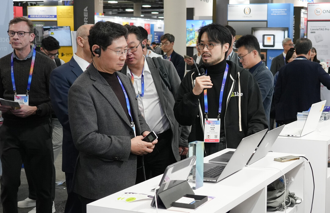 | ▲ 이상일 용인시장이 7일 미국 라스베이거스에서 열린 'CES 2025'의 용인 기업 부스를 방문해 제품에 대한 설명을 듣고 있다.[용인시 제공] |