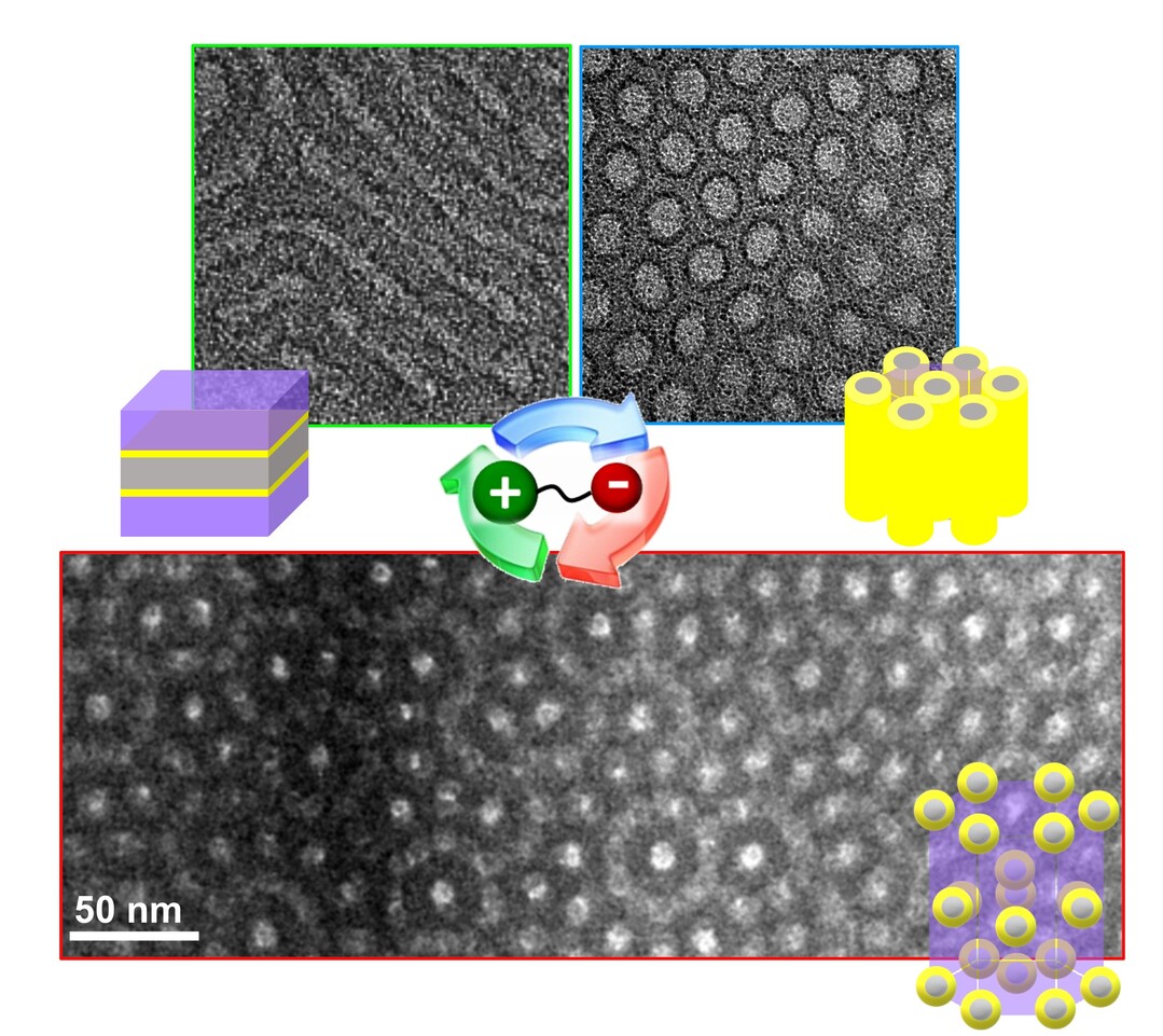▲ 양쪽성 이온 분자구조 및 혼합 비율에 따라 나타나는 초격자 층상, 실린더 구조 및 '프랭크-카스퍼 상'의 전자현미경 이미지. [포스텍 제공]