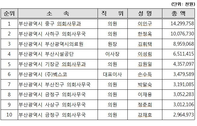 | ▲ 부산시 재산공개 대상자 187명(유관단체장 및 구·군 의원) 중 최상위 재산순위 [부산시 제공] |