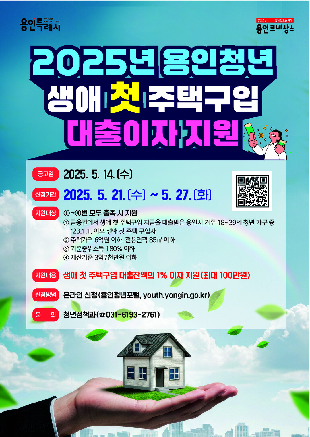 용인시가 생애 첫 주택구입 자금 대출을 받은 지역 내 청년을 대상으로 '2025년 청년 생애 첫 주택구입 대출이자 지원사업'을 시행한다.